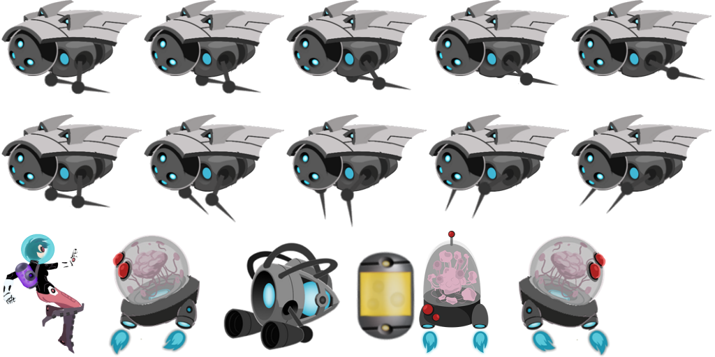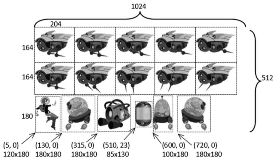 With this, we can store many if not all of our graphics in a single resource. In Figure 3-1, we see a sample sprite sheet. You will notice that the top two rows have variations of the same image and in the bottom row (second from the left), we have the same image we used in Tutorial 2 and a reverse facing copy in the far right. We can use these types of images to simulate motion and infer direction. Figure 3-2 provides more details about our sprite sheet.
